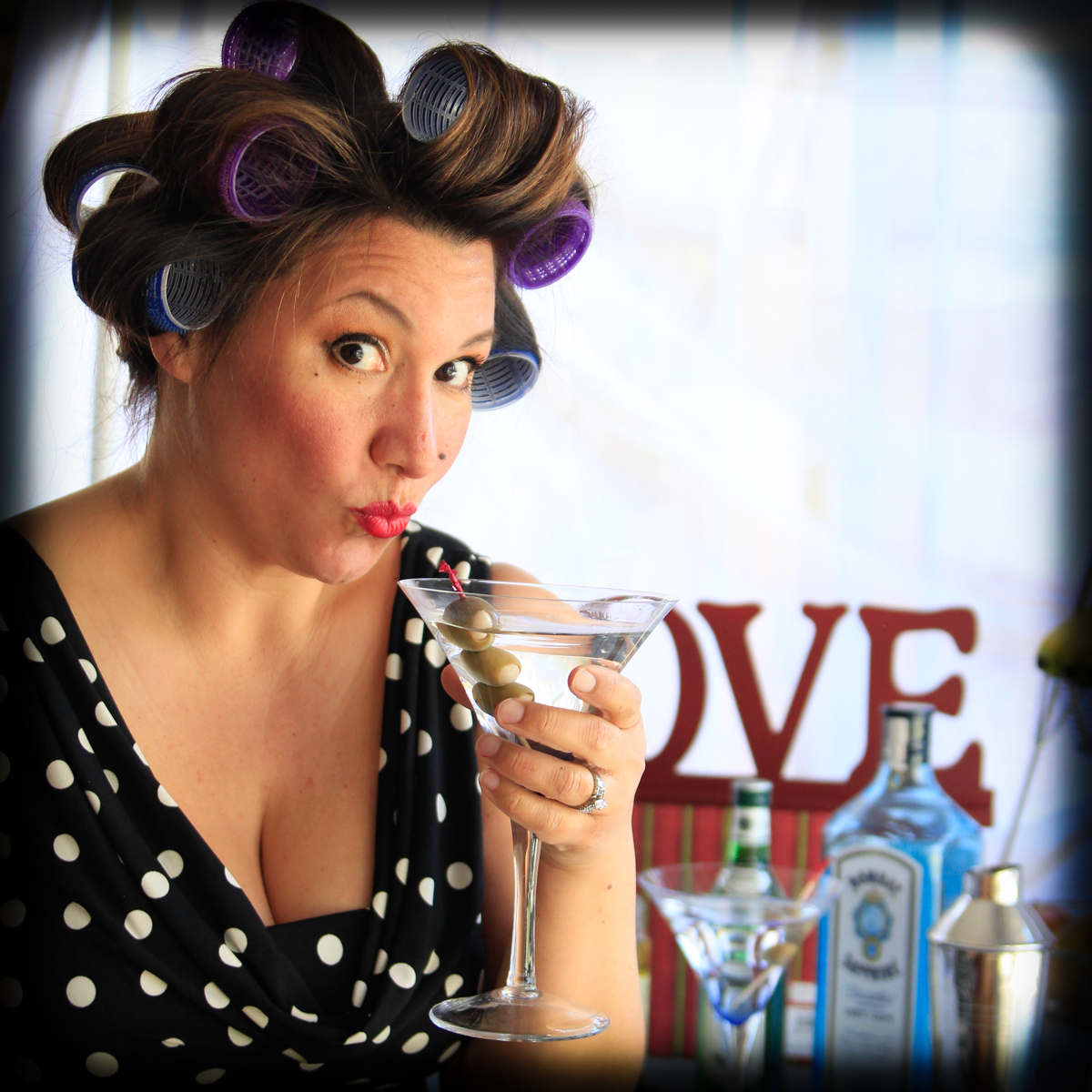 While I was staging the housewife/martini shot, I didn’t like the background in the shot (our kitchen window overlooking a fence and rather unkept banana tree). I grabbed a window sheer we use for our girls clubhouse in the backyard (mentioned in Feeling Crafty post) and rigged it. I added our “Love” decor piece, on top of a gift box to fill some of the white space. I still think there’s a lot of dead white space, but it works in not competing with the hair rollers.