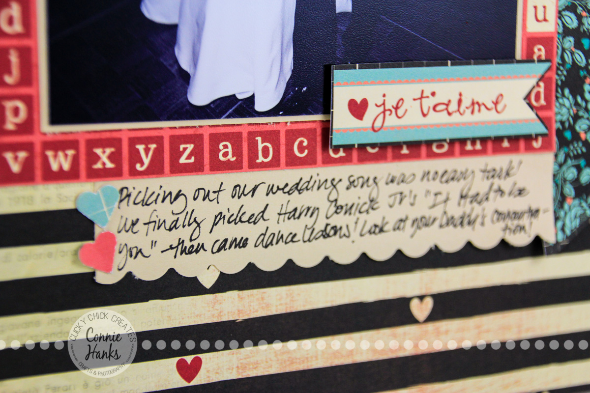 Being part of LOAD514 (Layout a day) this month (especially as a featured designer / scrapper), I just can’t tell you how great it feels to get these stories told! Once we finally decided on “It Had to be You” by Harry Connick Jr., my hubby was such a great sport agreeing to take dance lessons. After a false start on the dance floor, our DJ finally got the music right and we did our dance! Poor hubby, nervous as he was, I think he was counting the steps the entire dance, but he did great!