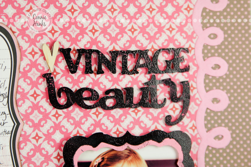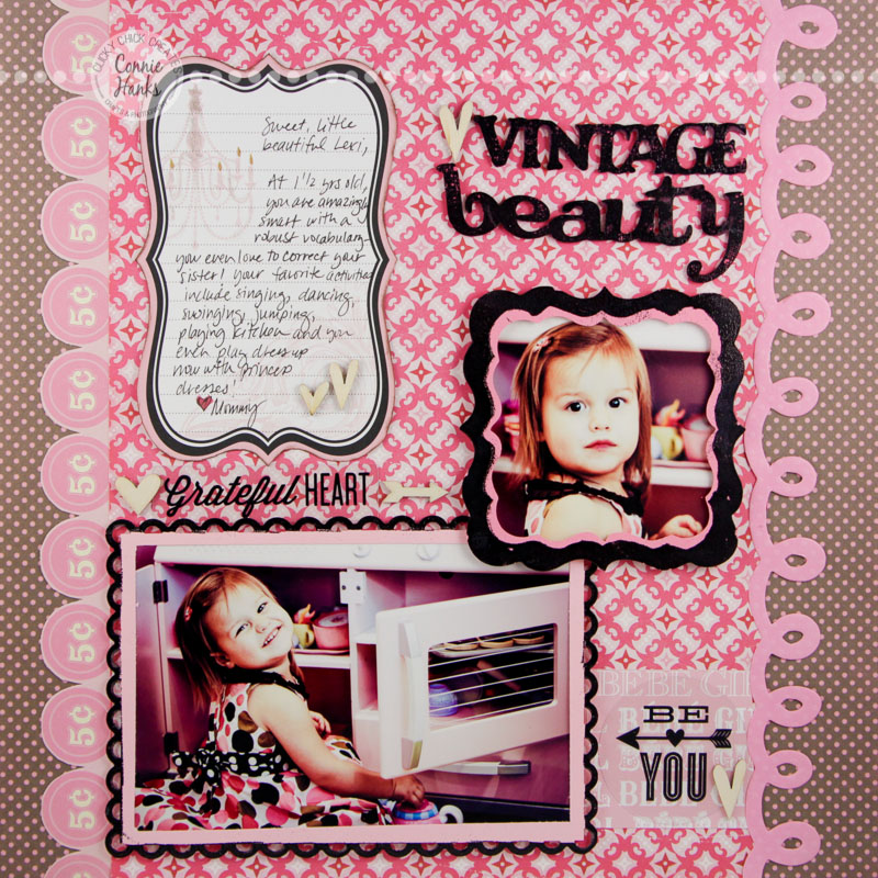 Product choices can help make our layout choices so much easier! I loved these photos of my baby girl and the vibe they gave with her dress and the retro kitchen. Digging through my stash, I found some old Teresa Collins journaling cards on a 12×12 sheet and loved the design. I wanted to mimic the feel of it, so I cut out a similar shape on pink cardstock usingΒ my Slice e-cutter, then heat embossed the edge of it with black embossing powder for the close-up photo.