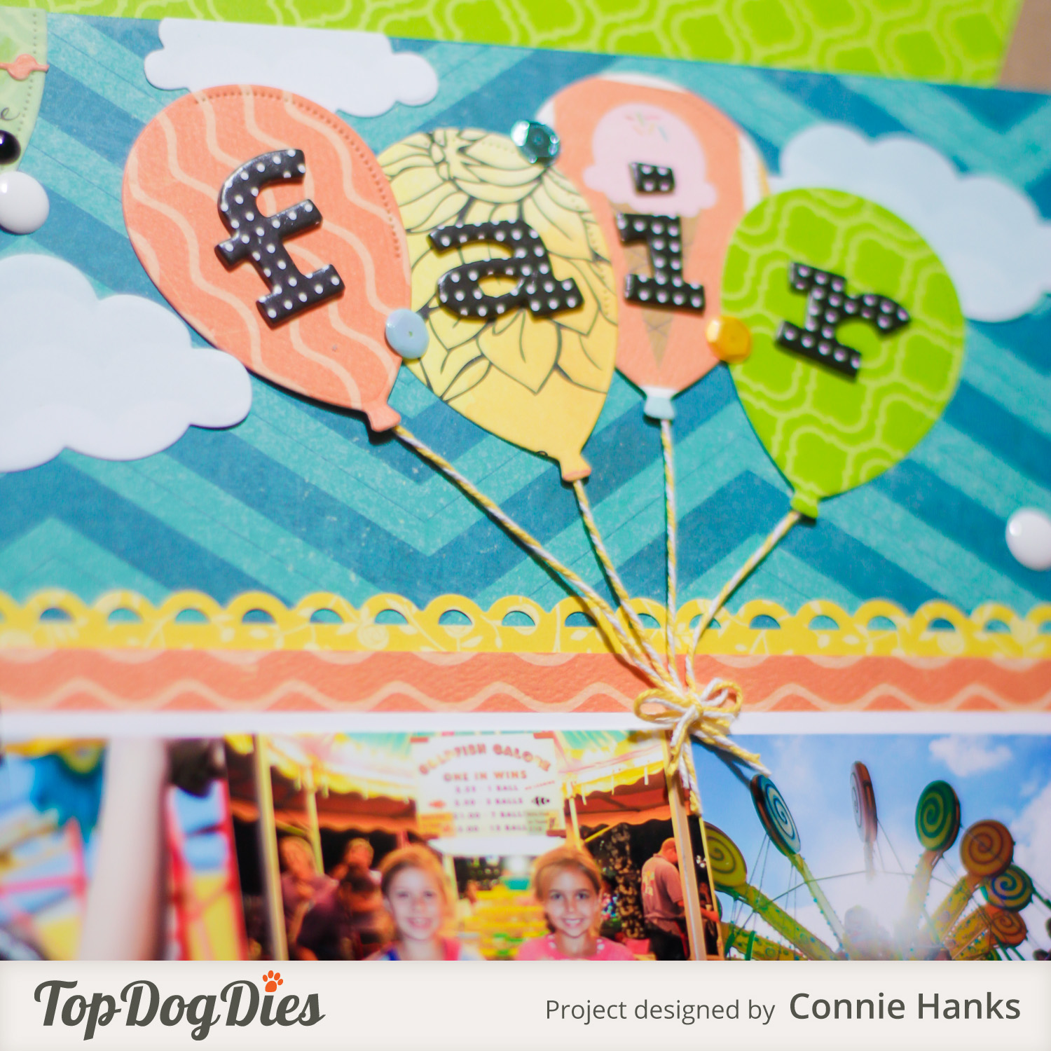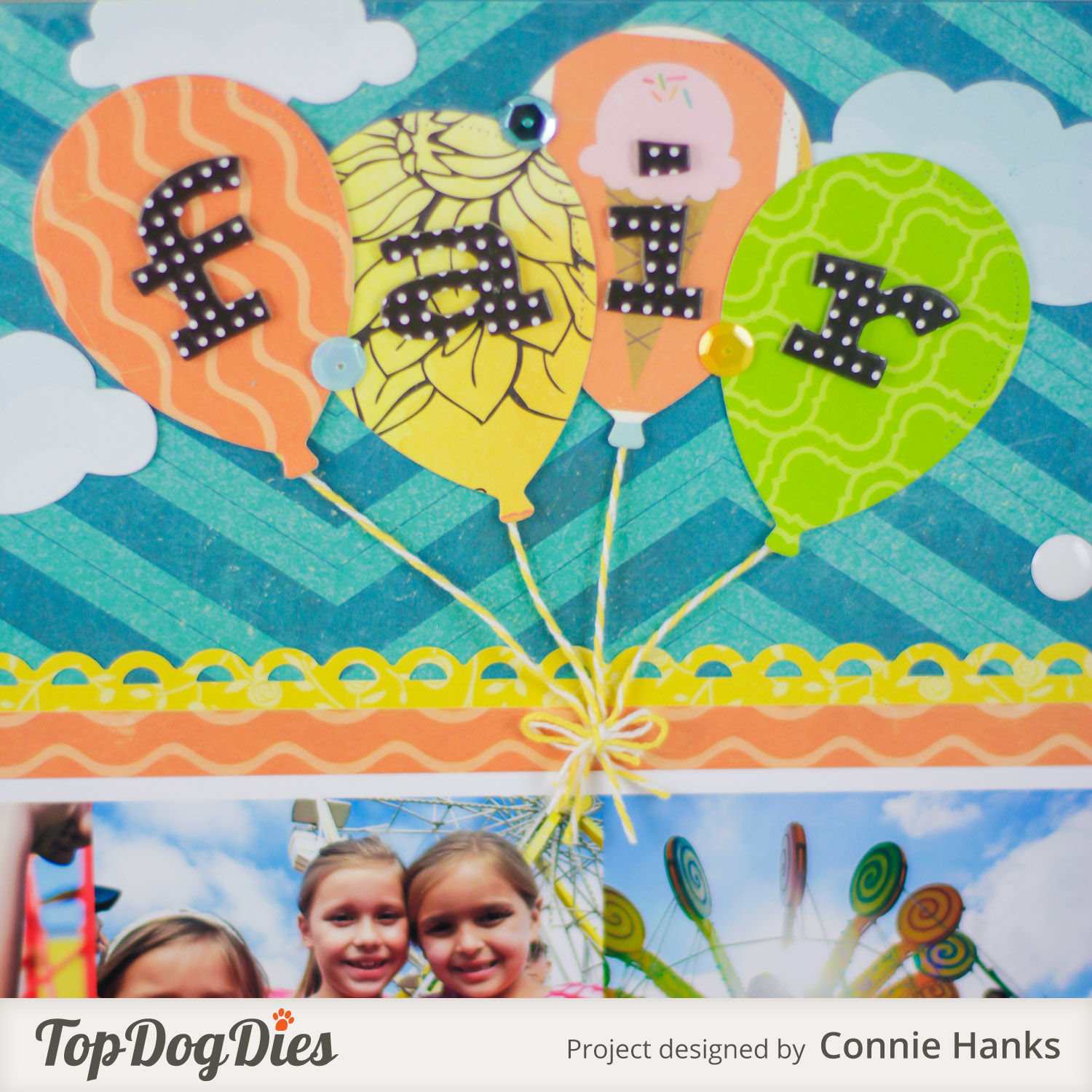 I used the Top Dog Dies Balloon Die Set to create the balloons for my page title, as well as the large balloon for my journaling! The set has some smaller balloons too. I love all the sizes and variations! I also used the clouds from the Hot Air Balloon Set. Also, notice the detailingΒ going across the large balloon with journaling? That’s using another new Top Dog Dies die – the Borders #1 set. I loved making these fun details for this layout!